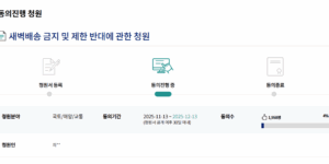 해결 방법 새벽배송 금지 반대 국민청원 바로가기 최근 ‘새벽배송 금지’ 여부를 두고 사회적 논의가 뜨겁습니다. 택배 노동자의 건강권과 수면권을 보장해야 한다는 입장과, 맞벌이 부부·소상공인·1인 가구 등에게는 이미 필수적인 ‘삶의 기반’이 되었다는 입장이 팽팽히 맞서고 있습니다. 이러한 상황 …