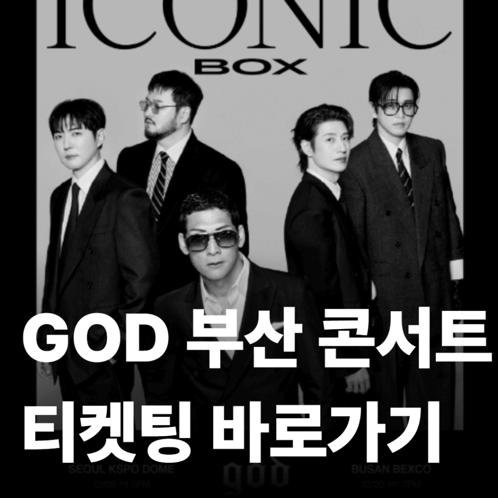✅ 공연명: 2025 god CONCERT <ICONIC BOX> – 부산 ✅ 공연 기간: 2025년 12월 20일(토) ~ 12월 21일(일) ✅ 공연 시간: 토 19시 / 일 17시 ✅ 공연 장소: 부산 벡스코 제1전시장 1&2홀 ✅ 관람 등급: 8세 이상 ✅ 관람 시간: 150분