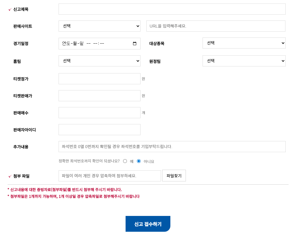 - 신고 대상: 당근마켓, 중고나라, SNS 등 온라인에서 정가보다 높게 판매되는 모든 프로스포츠 티켓