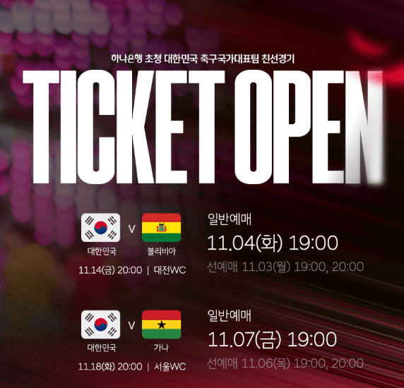 2025년 마지막 11월 A매치, 한국 가나 축구 경기는서울에서 열리게 되었는데요. 카타르 월드컵에서의 아쉬운 패배를 설욕할 이번 경기 선예매는 11월 6일, 일반예매는 11월 7일 입니다. 회원가입 해야 하니 예매 링크 아래에서 미리 확인해 보세요!👇
