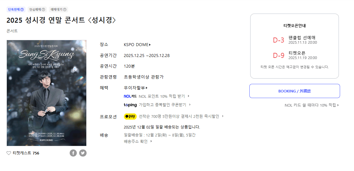 2025 성시경 연말 콘서트가 11월 13일 선예매, 11월 19일 일반예매로 오픈합니다. 가장 먼저 티켓 오픈 정보를 확인하고 예매에 성공하세요!👇