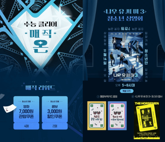 • 특별 상영: ‘나우 유 씨 미 3’ 청소년 상영회 (11/14, 7천원 관람 및 굿즈 증정)