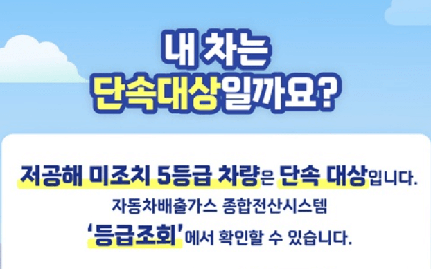 내 차량이 5등급에 해당하는지 여부는 ‘자동차배출가스 종합전산시스템’에서 쉽게 확인할 수 있습니다. 차량 출고 연식과 실제 기준 적용 연식이 다를 수 있으니 반드시 시스템을 통해 조회해야 합니다.