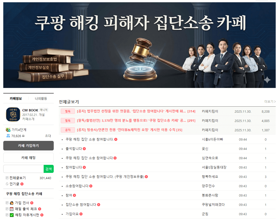 참여 곳: ‘쿠팡 해킹 피해자 모임’ 네이버 카페 (법률 대처 공유)