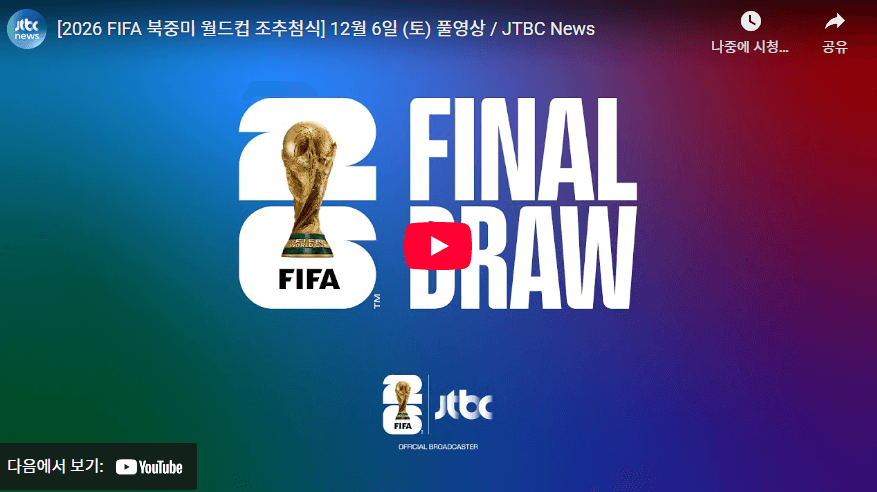 2026 월드컵 조추첨 결과가 발표되었는데, 다행히 대한민국은 우려했던 ‘죽음의 조’를 피하고 개최국 멕시코와 함께 A조에 편성되었습니다. 라이브 방송은 아래에서 다시보기 시청하세요