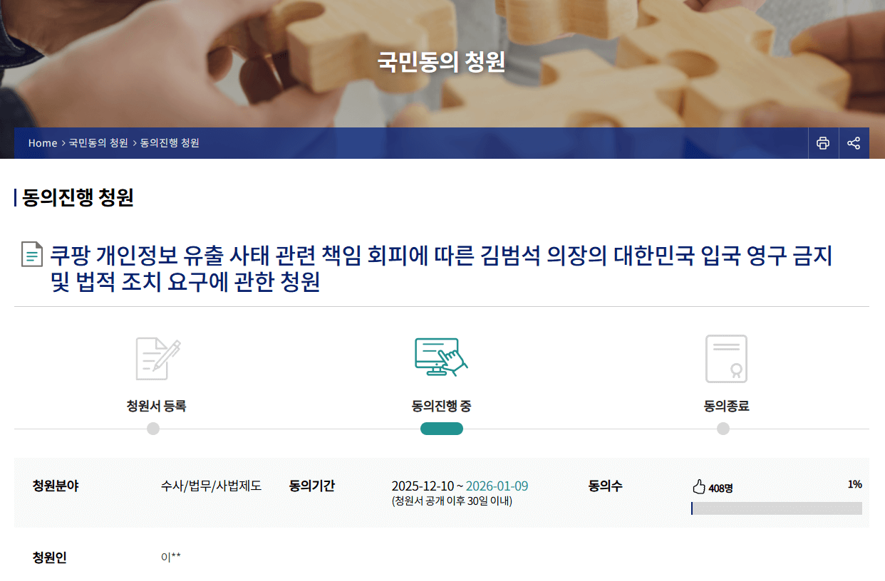 이번 쿠팡 김범석 입국 금지 관련 이슈는 외국 국적 기업인의 책임 범위를 어디까지 볼 것인가에 대한 중요한 사회적 화두를 던졌습니다. 국민의 소중한 개인정보와 권익을 보호하기 위해 시작된 이번 국민동의청원이 실제 제도 개선으로 이어질지 귀추가 주목되는데요. 청원을 원하시면 아래에서 지금 바로 국민청원 해보세요