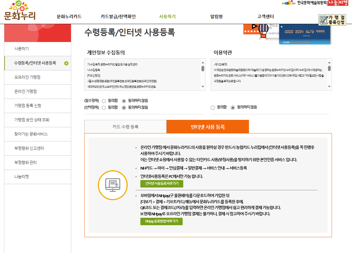 1. 문화누리카드 인터넷 사용등록 홈페이지