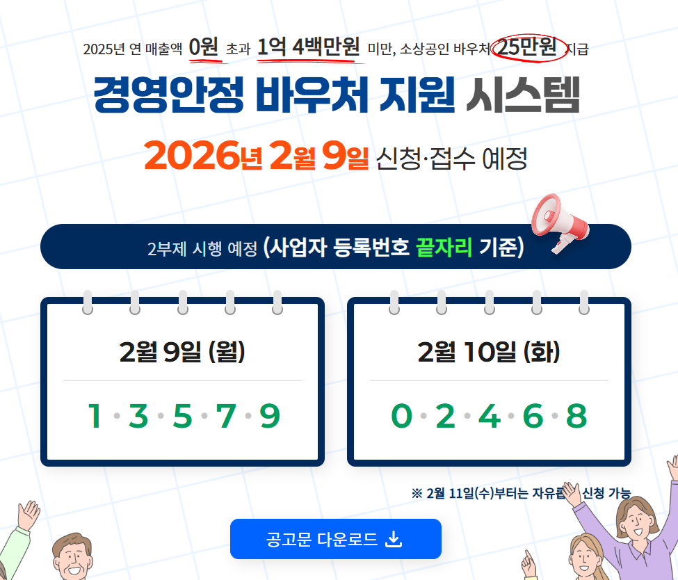 2026년 2월 9일부터 연매출 1억 400만원 미만 영세 소상공인에게 최대 25만원의 공과금 지원 바우처가 지급됩니다. 신청 첫 이틀간은 필수적으로 확인해야 할 2부제 요건이 있으니 내 신청 날짜를 미리 확인하고 아래에서 접수 빠르게 해보세요!