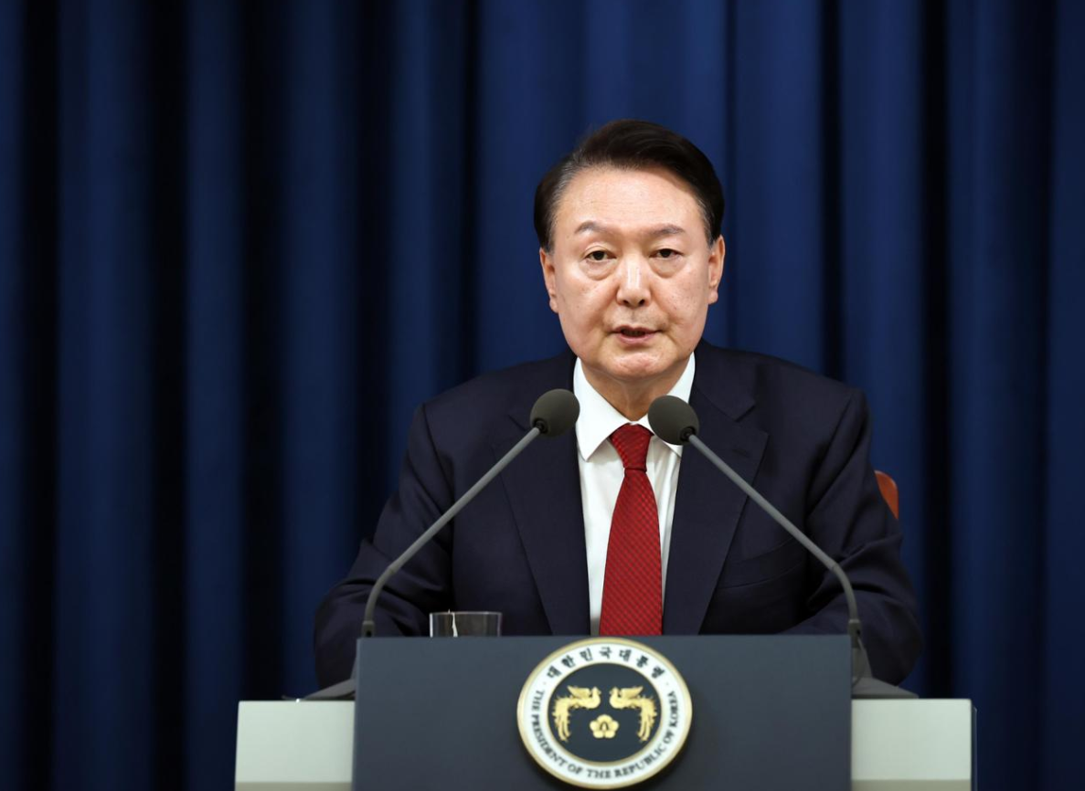 윤석열 대통령이 2024년 12월 3일 밤 서울 용산 대통령실 청사에서 긴급 대국민 특별 담화를 하며 비상계엄을 선포하고 있다.
